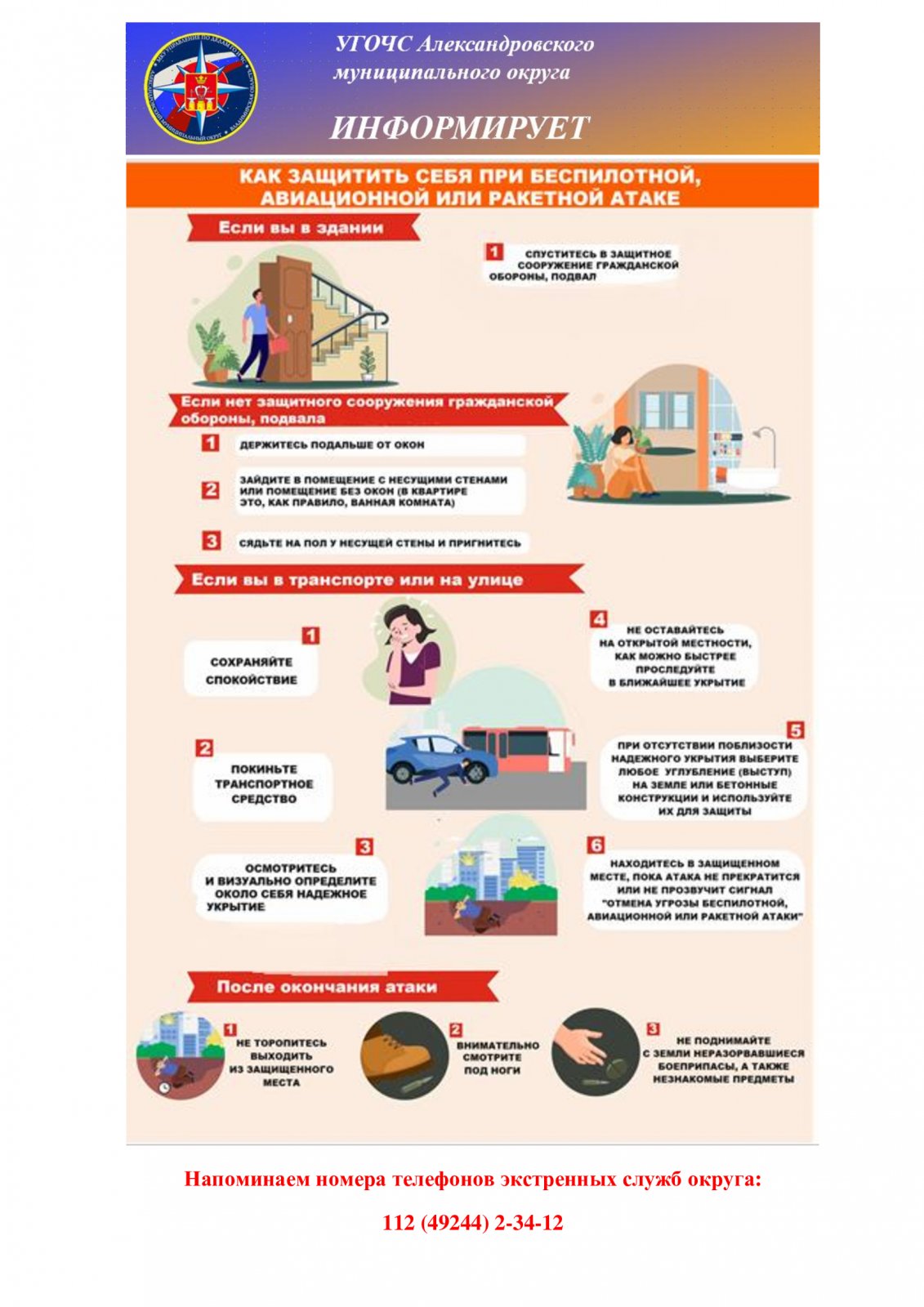 МКУ УГОЧС Александровского муниципального округа предлагает ознакомиться с правилами поведения гражданского населения в случае получения сигнала "Ракетная опасность".